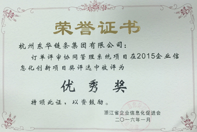 東華自創(chuàng)建以來,一直高度重視企業(yè)信息化建設(shè)工作,取得良好成效。日前,訂單評(píng)審協(xié)同管理系統(tǒng)被浙江省企業(yè)信息化促進(jìn)會(huì)授予“2015企業(yè)信息化創(chuàng)新項(xiàng)目?jī)?yōu)秀獎(jiǎng)”稱號(hào)。