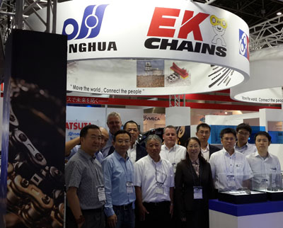本屆展會(huì)上,東華集團(tuán)聯(lián)合展出了中國、德國和日本三個(gè)生產(chǎn)基地制造的各種標(biāo)準(zhǔn)鏈、農(nóng)機(jī)鏈、齒形鏈、鋼廠輸送鏈、扶梯鏈、散物料輸送鏈、汽車工業(yè)鏈、食品工業(yè)鏈、木材加工鏈、污水處理設(shè)備鏈、加工中心刀庫鏈、焊接彎板鏈,帶密封圈的摩托車鏈條等公司優(yōu)勢產(chǎn)品,吸引了來自全球絡(luò)繹不絕的客戶參觀與洽談。集團(tuán)總工程師葉斌、副總經(jīng)理馬愛華、國際貿(mào)易部王偉強(qiáng)處長和業(yè)務(wù)員在現(xiàn)場熱情地接待了來自全球的新老客戶。