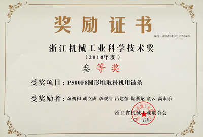 4月23日,浙江省機械工業(yè)聯(lián)合會四屆二次理事(擴大)會議暨2014年度科學技術獎頒獎大會在杭州召開。會上,浙江機械工業(yè)聯(lián)合會表彰了52項“2014年度浙江機械工業(yè)科學技術獎”獎勵項目。由東華集團技術中心組織申報、集團所屬杭州自強鏈傳動有限公司工程鏈事業(yè)部為主研發(fā)的“P500F8圓形堆取料機用鏈條”高端產(chǎn)品項目榮獲三等獎,這是東華集團的產(chǎn)品創(chuàng)新項目連續(xù)三年榮獲浙江省機械工業(yè)科學技術獎,也是2014年度全省諸多機械產(chǎn)品中唯一一項鏈傳動產(chǎn)品開發(fā)項目獲獎。