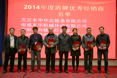 最后,內(nèi)銷公司總經(jīng)理戴迪漢宣讀了東華19名2014年度“優(yōu)秀經(jīng)銷商”名單;盾牌公司總經(jīng)理錢文孝宣讀了盾牌6名2014年度“優(yōu)秀經(jīng)銷商”名單。董事長宣碧華向獲獎(jiǎng)經(jīng)銷商頒發(fā)了獎(jiǎng)杯和證書,并合影留戀。