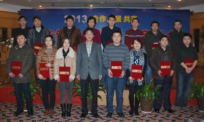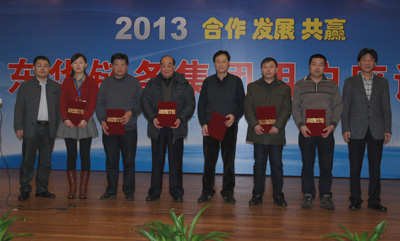 最后,內(nèi)銷公司總經(jīng)理戴迪漢分別宣讀了東華集團(tuán)和盾牌公司2012年優(yōu)秀經(jīng)銷商名單,宣碧華董事長(zhǎng)向優(yōu)秀經(jīng)銷商頒發(fā)了榮譽(yù)證書并合影留戀。