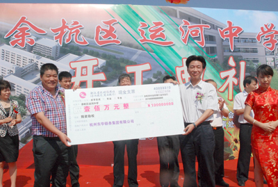 7月3日,烈日炎炎,在運(yùn)河中學(xué)舉行的開工典禮上,東華集團(tuán)董事長(zhǎng)宣碧華熱心參與余杭區(qū)運(yùn)河鎮(zhèn)組織的“捐資助校·功德千秋”慈善捐贈(zèng)活動(dòng),向運(yùn)河中學(xué)建校捐款100萬(wàn)元,為“運(yùn)河中學(xué)”建設(shè)項(xiàng)目添磚加瓦,充分體現(xiàn)了東華集團(tuán)關(guān)心、支持教育事業(yè)的拳拳愛心。