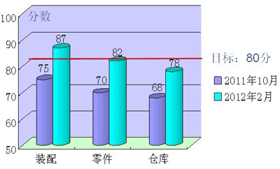 開(kāi)展檢查評(píng)比,落實(shí)持續(xù)改善 事業(yè)部不定期對(duì)各部門(mén)的改善活動(dòng)進(jìn)行檢查評(píng)價(jià),每月至少2次,覆蓋所有單位區(qū)域,通過(guò)TPS專(zhuān)員和組員的聯(lián)合檢查評(píng)價(jià),利用《5S評(píng)分表》進(jìn)行打分排名并對(duì)改善滯后的員工進(jìn)行再培訓(xùn)并達(dá)到標(biāo)準(zhǔn),對(duì)活動(dòng)開(kāi)展積極,效果明顯的進(jìn)行獎(jiǎng)勵(lì),激勵(lì)各單位持續(xù)做好改善工作。檢查評(píng)比把重點(diǎn)放在現(xiàn)場(chǎng)的掌握上,通過(guò)現(xiàn)場(chǎng)檢查發(fā)現(xiàn)的問(wèn)題被納入事業(yè)部5S、TPS 的改善對(duì)象,列入改善計(jì)劃,落實(shí)具體改善措施,整個(gè)活動(dòng)基本進(jìn)入“有檢查、有措施、有落實(shí)”的良性循環(huán)。目前現(xiàn)場(chǎng)整體效果良好,基本實(shí)現(xiàn)了現(xiàn)場(chǎng)清爽、分類(lèi)清楚、定置有序的目標(biāo),進(jìn)一步提升了現(xiàn)場(chǎng)可視化效果。