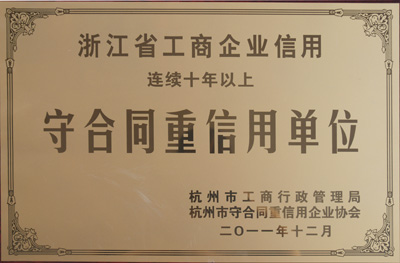 鑒于東華集團(tuán)長(zhǎng)期以來在企業(yè)發(fā)展中誠信、守合同重信用,日前被杭州市工商信用管理局、杭州市守合同重信用企業(yè)協(xié)會(huì)聯(lián)合授予浙江省工商企業(yè)信用連續(xù)十年以上“守合同重信用”單位榮譽(yù)稱號(hào)。