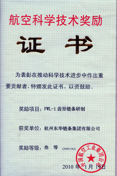 近年來(lái),東華集團(tuán)研制的FWL-1齒形鏈條產(chǎn)品是首款用于航空器上的鏈條產(chǎn)品,故要求極高的可靠性和壽命。對(duì)該產(chǎn)品的開(kāi)發(fā)受到軍方的高度關(guān)注,分別經(jīng)過(guò)了軍方的首次開(kāi)發(fā)技術(shù)鑒定、首款產(chǎn)品樣件鑒定和量產(chǎn)件產(chǎn)品技術(shù)鑒定等三個(gè)階段,歷時(shí)三年。該航空鏈條的成功開(kāi)發(fā)填補(bǔ)了國(guó)內(nèi)航空領(lǐng)域用鏈條的技術(shù)空白,打破了以往該類產(chǎn)品長(zhǎng)期依賴進(jìn)口,被國(guó)外技術(shù)壟斷的局面,成功取代進(jìn)口,為中國(guó)的國(guó)防建設(shè)做出了突出貢獻(xiàn)。