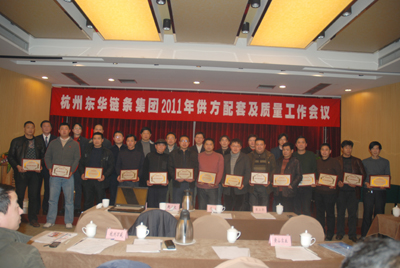 隨后,張寶康副總宣布2010年“優(yōu)秀供方”與“特別貢獻獎”供方名單,與會領導向獲獎供應商頒發(fā)了證書并合影留念.杭州萬盛精拉絲有限公司崔總作為“優(yōu)秀供方”代表與 杭州三志緊固件軸承有限公司屠董作為“特別貢獻獎”代表上臺作了發(fā)言。