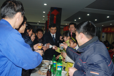 席間,總經(jīng)理張世強(qiáng)冒著雨雪天氣,奔波兩個(gè)生產(chǎn)廠區(qū),向每一個(gè)員工表達(dá)了新春的問候,同時(shí),對(duì)員工們?yōu)闁|華的發(fā)展付出的辛勤勞動(dòng)表達(dá)了感激之情。期間,張總向每一桌員工送酒,向每一個(gè)員工敬酒,對(duì)留守員工表示親切慰問,噓寒問暖。大家在同吃年夜飯,同喝喜慶酒,同吃餃子、同慶佳節(jié)之際,促進(jìn)了彼此的交流、增強(qiáng)了彼此的感情。