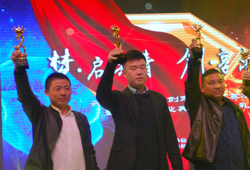 副董事長宣成(中)與其他十佳創(chuàng)業(yè)明星高興獎杯