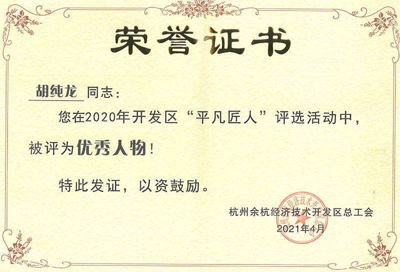 繽紛四月,東華鏈條集團(tuán)傳動(dòng)鏈?zhǔn)聵I(yè)部員工胡純龍被余杭經(jīng)濟(jì)技術(shù)開(kāi)發(fā)區(qū)總工會(huì)授予2020年“平凡匠人”稱號(hào),這又是一次對(duì)他在平凡崗位上做出不平凡工作的認(rèn)可!