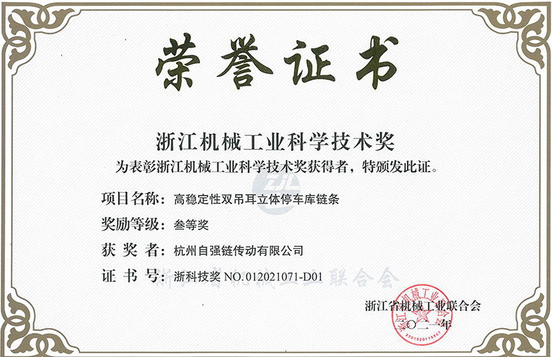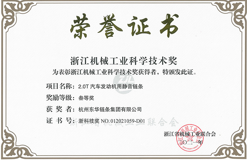 6月30日,浙江省機(jī)械工業(yè)聯(lián)合會(huì)召開(kāi)會(huì)員大會(huì)。會(huì)上表彰2021年度浙江機(jī)械工業(yè)科學(xué)技術(shù)獎(jiǎng),全省機(jī)械領(lǐng)域共有72項(xiàng)科技創(chuàng)新項(xiàng)目獲獎(jiǎng)。東華 “2.0T汽車發(fā)動(dòng)機(jī)用靜音鏈條”和“高穩(wěn)定性雙吊耳立體停車庫(kù)鏈條”均獲三等獎(jiǎng),這是東華產(chǎn)品創(chuàng)新項(xiàng)目連續(xù)十年榮獲浙江機(jī)械工業(yè)科技獎(jiǎng),也是2021年度全省機(jī)械行業(yè)科技創(chuàng)新成果獎(jiǎng)中唯一鏈傳動(dòng)企業(yè)的高端產(chǎn)品獲獎(jiǎng)。