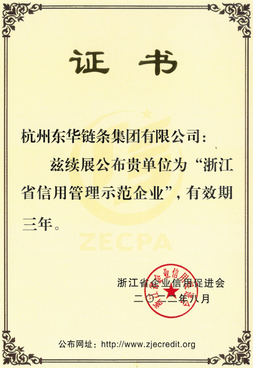 日前,浙江省企業(yè)信用促進會公布了2022年度續(xù)展“浙江省信用管理示范企業(yè)”的決定,東華鏈條集團成功續(xù)展。