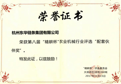 峰會(huì)后舉行了第八屆“精耕杯”頒獎(jiǎng)典禮活動(dòng),共設(shè)置評(píng)委會(huì)“綠色獎(jiǎng)”、“創(chuàng)新獎(jiǎng)”、“設(shè)計(jì)獎(jiǎng)”、“中國市場(chǎng)影響力品牌”、“配套伙伴獎(jiǎng)”五大類共35個(gè)獲獎(jiǎng)席位,推舉出了我國農(nóng)機(jī)行業(yè)的年度榜樣和年度力量。東華集團(tuán)榮獲“配套伙伴獎(jiǎng)”。