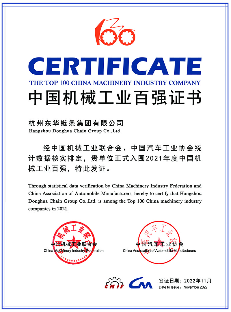 東華鏈條集團(tuán)連續(xù)七年榮登中國機(jī)械工業(yè)百強(qiáng)榜
