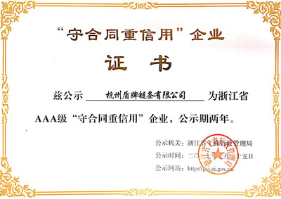 日前,杭州盾牌鏈條有限公司被浙江省工商行政管理局認定為2017年度“浙江省AAA級守合同重信用企業(yè)”,這是繼2015年首次獲得“AA級守合同重信用”企業(yè)在合同管理及履行上的又一次進步。盾牌公司會一如既往重視企業(yè)合同信用管理,不斷提高企業(yè)合同管理水平。