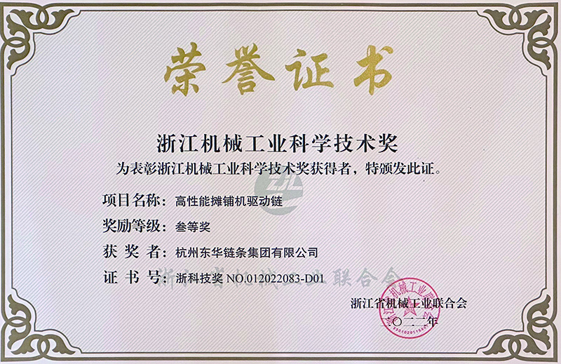 4月27日,浙江省機械工業(yè)聯(lián)合會召開會員大會,會上隆重表彰了2022年度浙江機械工業(yè)科學技術獎。東華鏈條集團自主研發(fā)的“高性能攤鋪機驅動鏈”產品獲評三等獎,這是2022年全省機械行業(yè)科技創(chuàng)新成果中僅有的兩項高端鏈傳動產品及制造裝備獲獎項目之一,也是東華產品創(chuàng)新項目連續(xù)十一年獲評浙江機械科技獎。