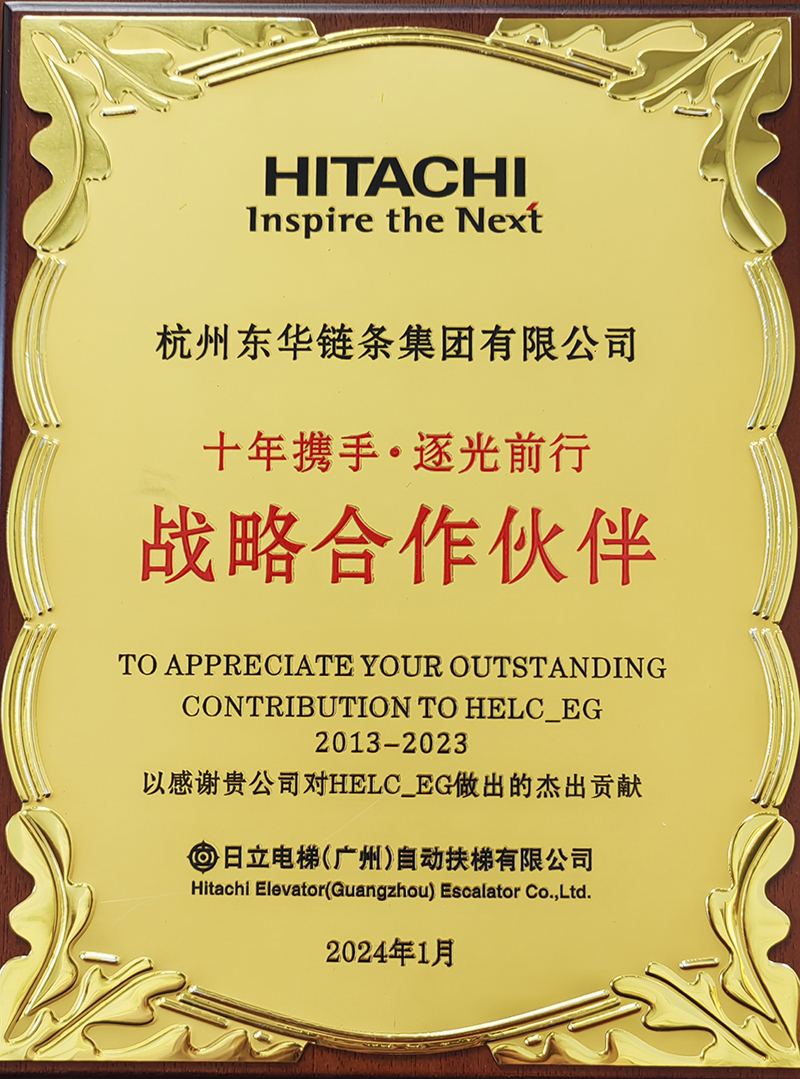 日立電梯(廣州)自動扶梯有限公司是東華的重點配套主機客戶,其配套產品涵蓋商用梯、公交梯,雙方在多年的合作中已建立了良好的合作基礎。2023年,扶梯工程鏈事業(yè)部積極實施細分市場冠軍戰(zhàn)略,堅持專業(yè)化、系統(tǒng)化、高端化和高質量發(fā)展的定位,不斷開發(fā)和滿足日立電梯的需求,積極走訪市場,在產品制造過程中嚴控工藝、提升交付率,在產品質量上更是精益求精,全方位提升服務。此次東華獲得2023年度突出貢獻獎和戰(zhàn)略合作伙伴獎是日立電梯(廣州)自動扶梯有限公司對東華扶梯鏈產品質量的高度肯定,也讓我們對2024年服務好客戶信心倍增。