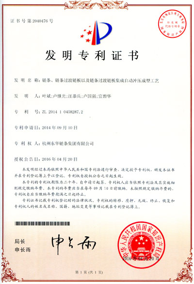 多年來,東華集團(tuán)以每天研發(fā)兩至三個新品種的研發(fā)能力一直成為中國鏈傳動行業(yè)標(biāo)桿企業(yè)的標(biāo)志,尤其是每年獲得的專利都取得很好的社會效益和經(jīng)濟(jì)效益。如今年獲得的六件發(fā)明專利中:一種無聲鏈多顆落料光亮沖裁復(fù)合模,該發(fā)明實現(xiàn)了高速大批量生產(chǎn)表面及內(nèi)孔光亮的無聲鏈鏈板,避免了級進(jìn)模上采用擠光方式獲得光亮帶導(dǎo)致的原材料浪費,同時這種模具結(jié)構(gòu)對機床精度和送料機構(gòu)要求不高,降低了設(shè)備折舊成本;如鏈條、鏈條過渡鏈板以及鏈條過渡鏈板集成自動沖壓成型工藝,本發(fā)明的目的在于克服現(xiàn)有技術(shù)中存在的不足,而提供一種鏈條、鏈條過渡鏈板以及鏈條過渡鏈板集成自動沖壓成型工藝,通過把多個加工過程集成,用一臺沖制設(shè)備代替?zhèn)鹘y(tǒng)的沖制設(shè)備、退火設(shè)備和壓彎設(shè)備,提高效率,大大減少了加工設(shè)備和人工,降低了生產(chǎn)能耗,大大縮短了產(chǎn)品加工流程,顯著提高了過渡鏈板生產(chǎn)時的安全性。