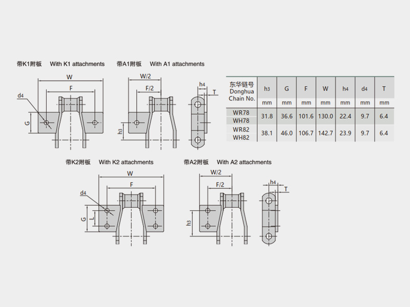 ● 工程用焊接結(jié)構(gòu)彎板鏈按照ASME B29.16M《鋼制焊接工程鏈、附件和鏈輪齒形》和ISO 6972《焊接結(jié)構(gòu)工程用彎板鏈、附件和鏈輪》設(shè)計和制造,有多種附件可供選擇,也可以按照用戶需求進行定制開發(fā)。